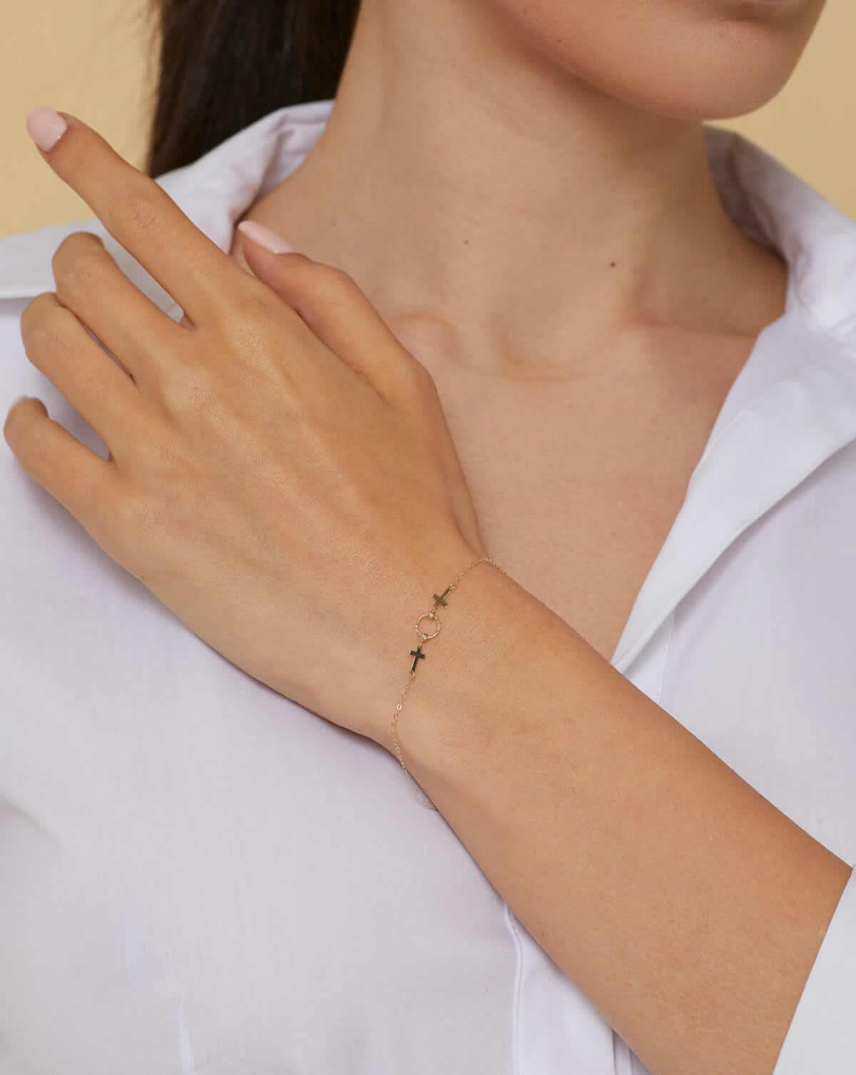 A modern fusion of meaning and minimalism — this 14K gold bracelet features two sleek cross charms flanking a textured circle, symbolizing unity, faith, and balance.