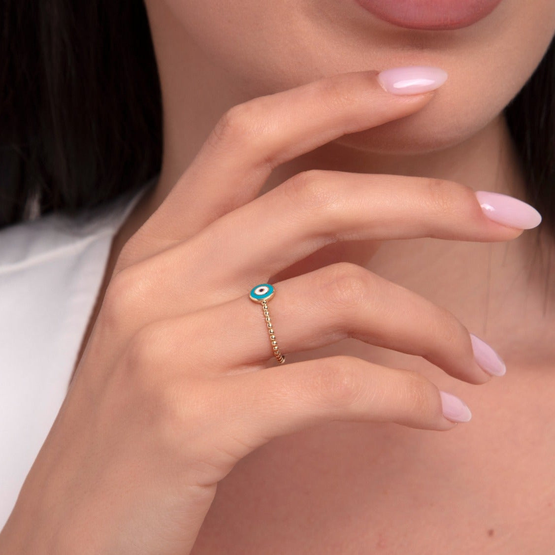 Close-up of a woman's hand wearing a 14K gold evil eye ring with a blue enamel charm