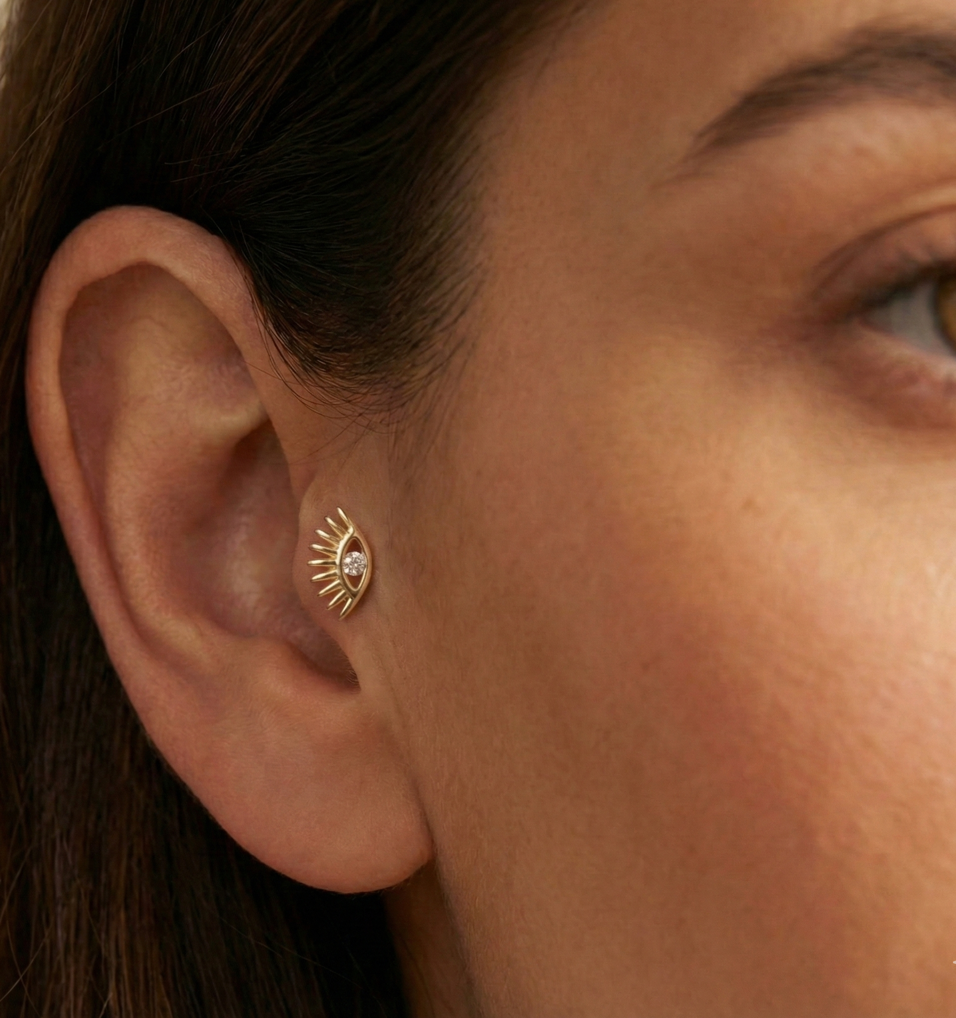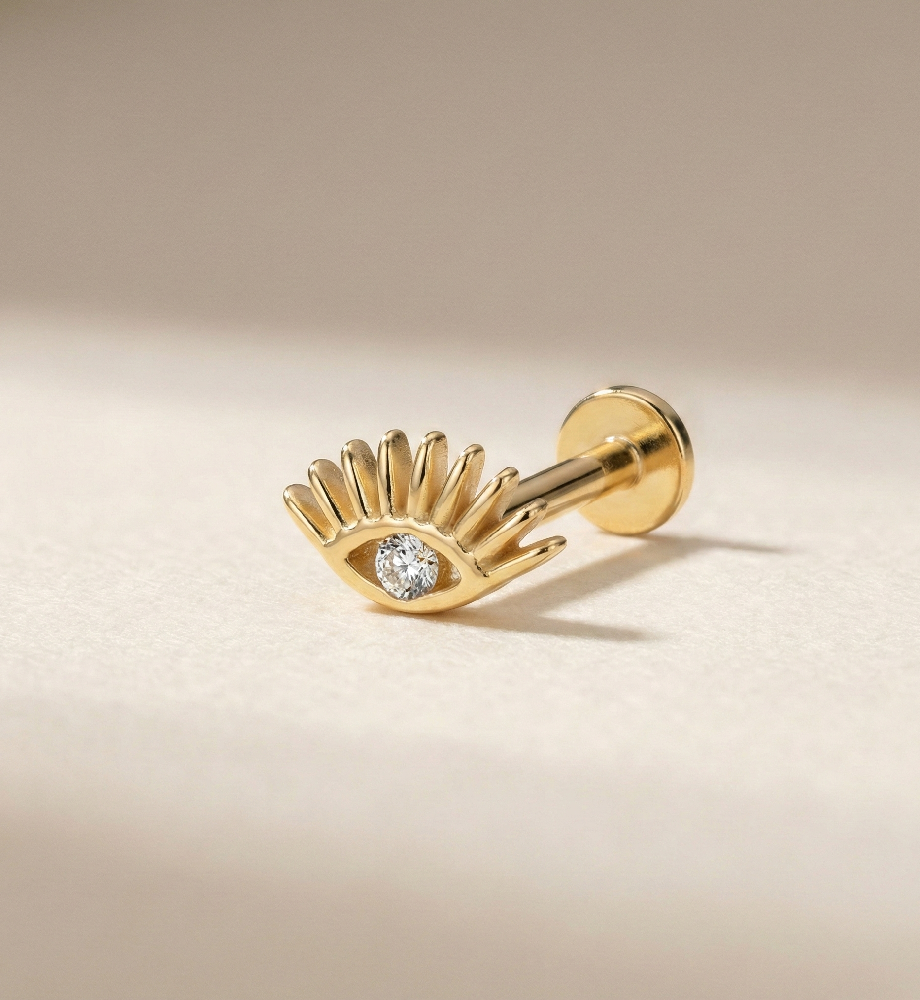 Protect your vibe with this 14K gold eye tragus stud. Flat back design offers comfort and sparkle with a symbolic twist.