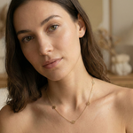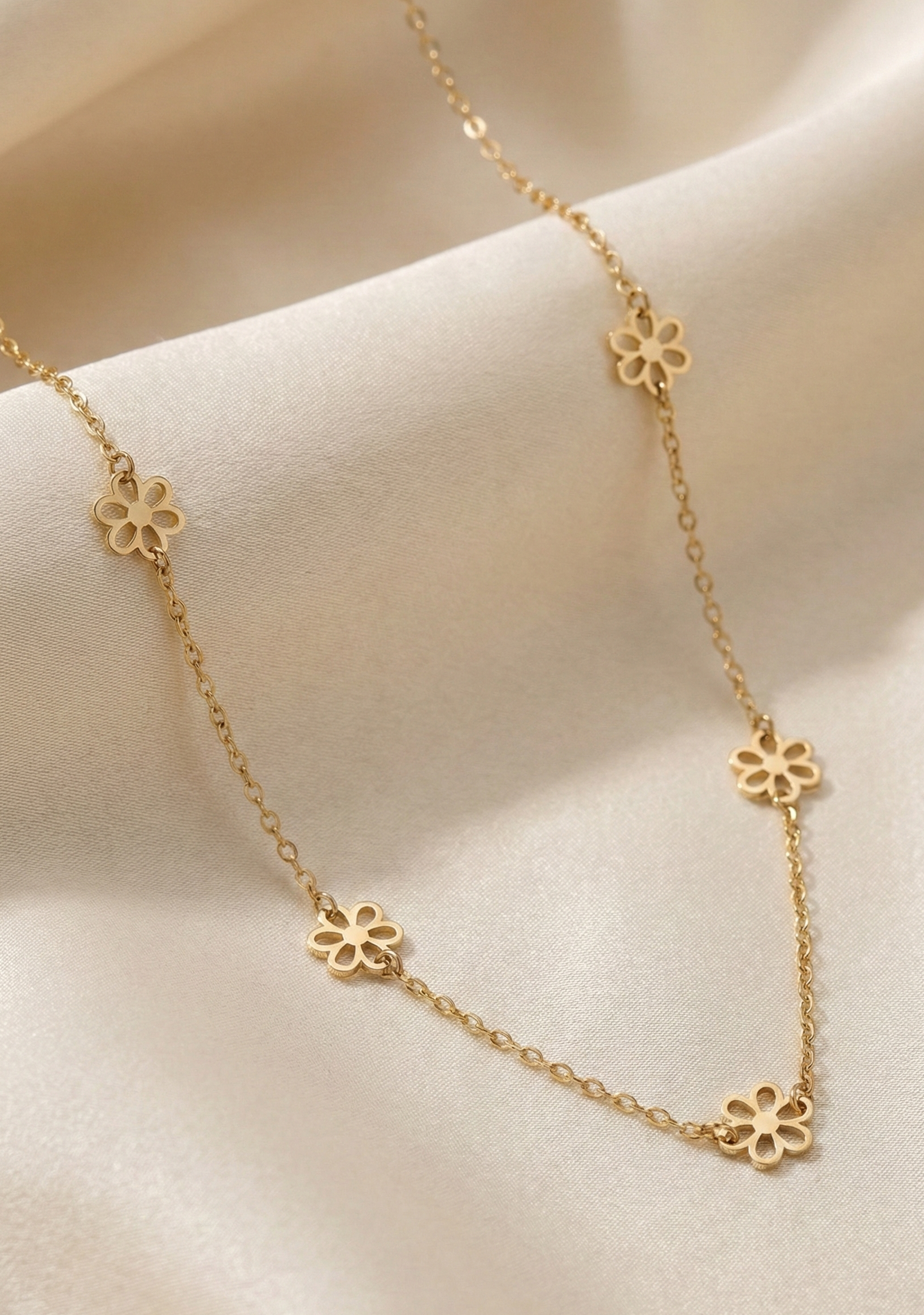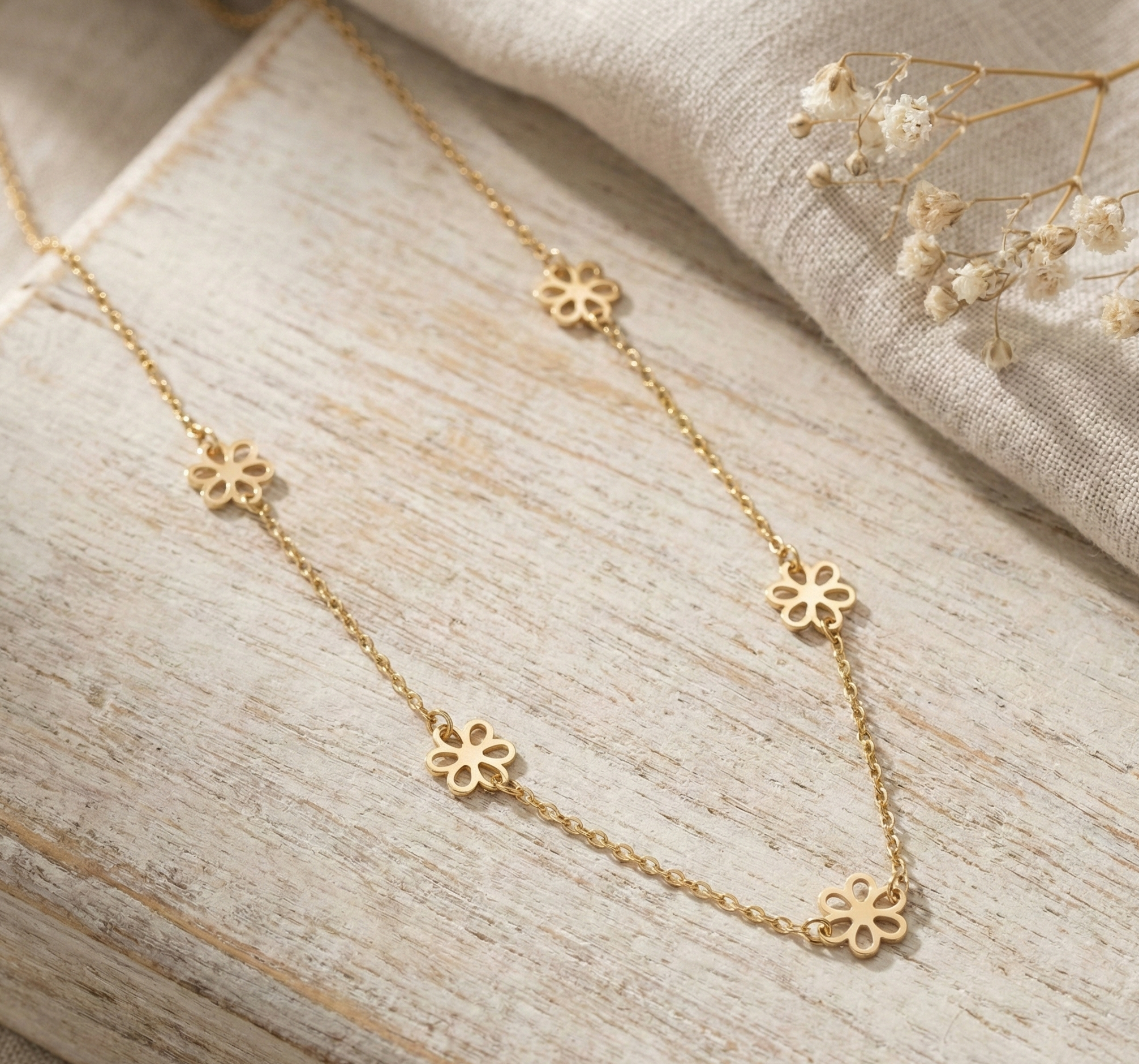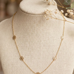 14K gold necklace with open flower station charms evenly spaced on delicate chain