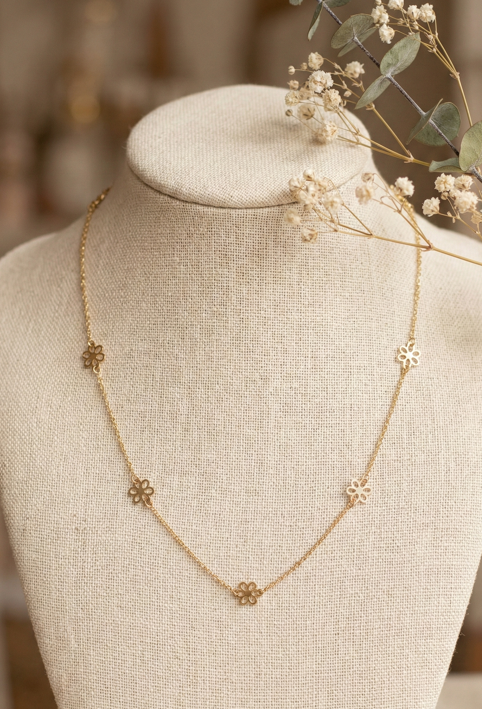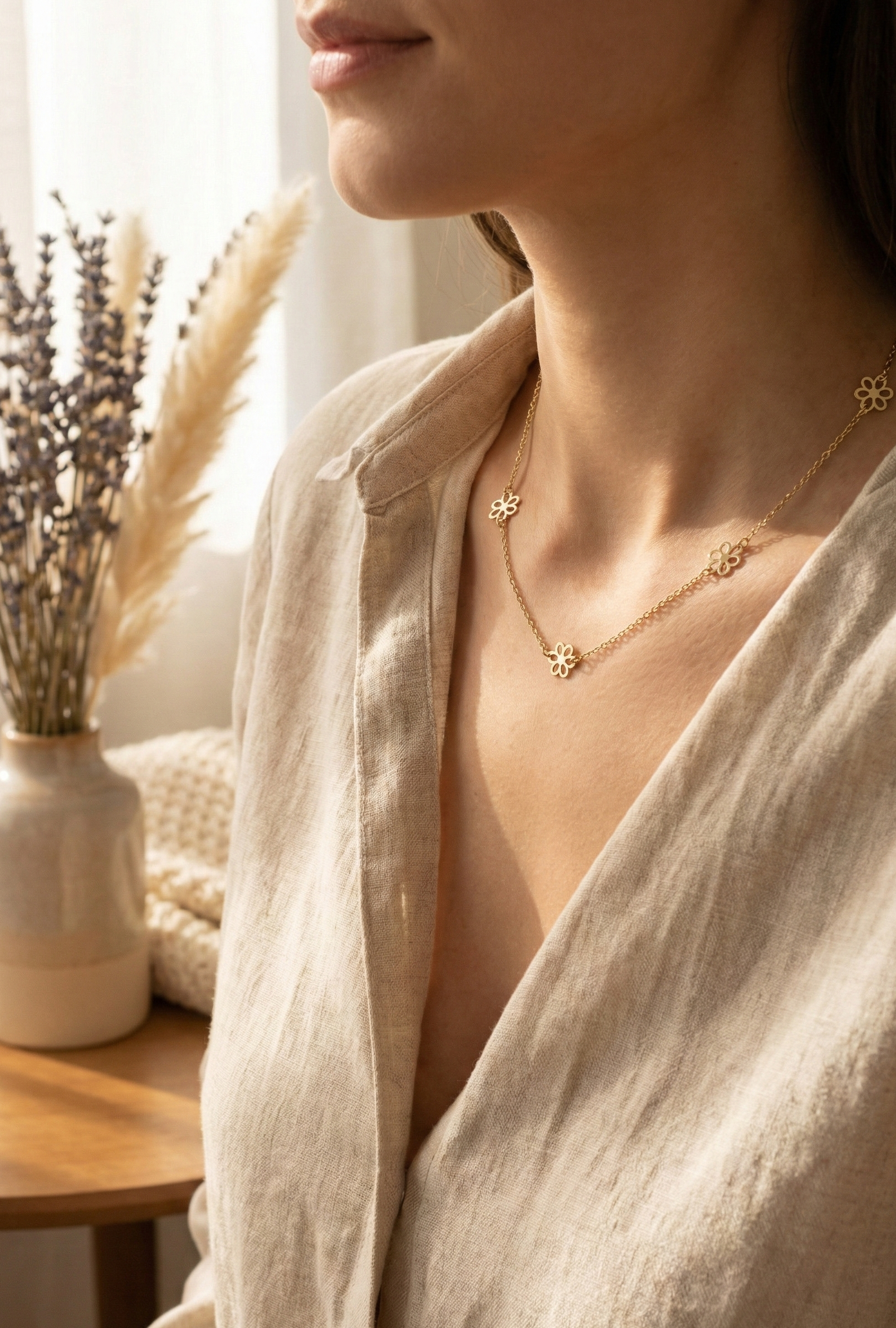 Daisy-inspired gold necklace symbolizing purity and joy