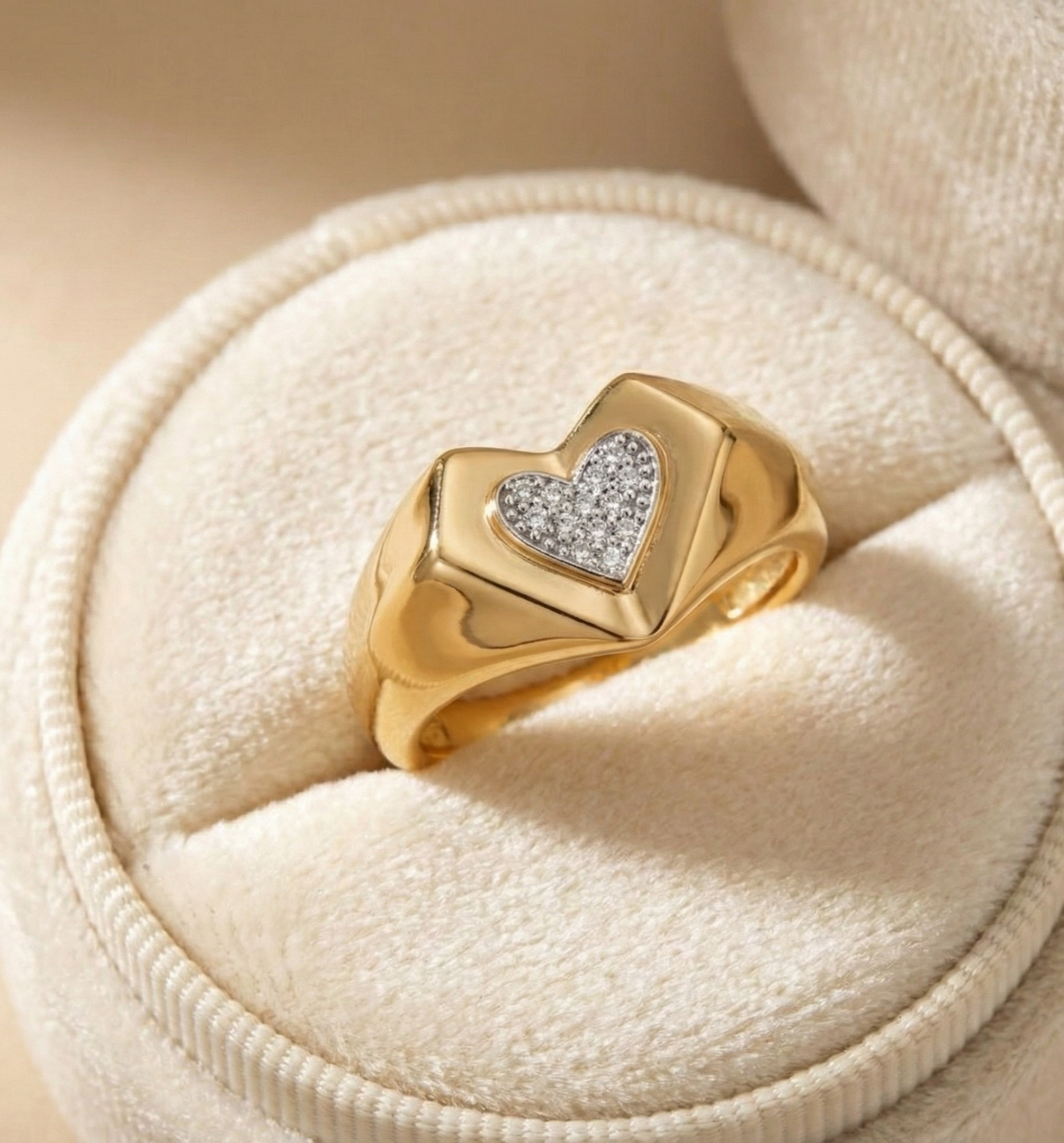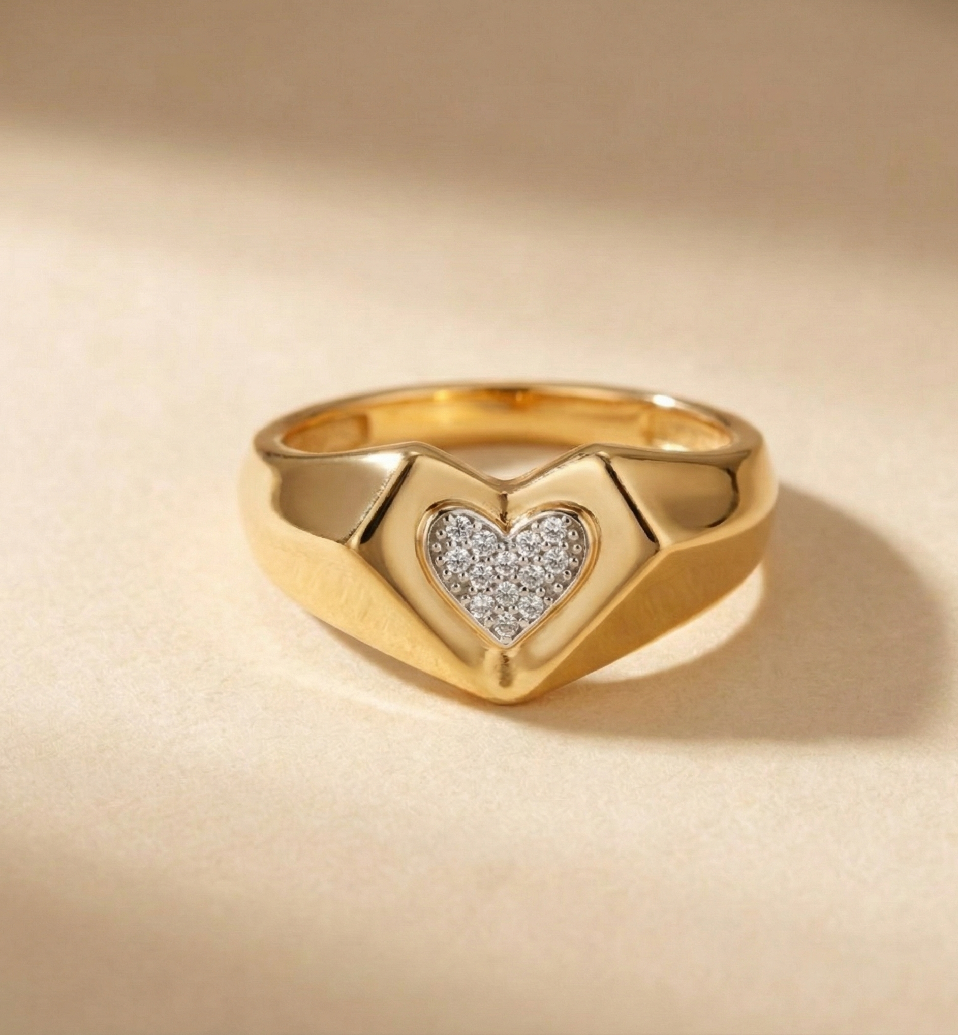 A 14K yellow gold signet ring featuring a pavé diamond heart motif, designed as a bold statement ring, romantic gift, or everyday symbol of love.
