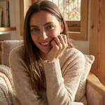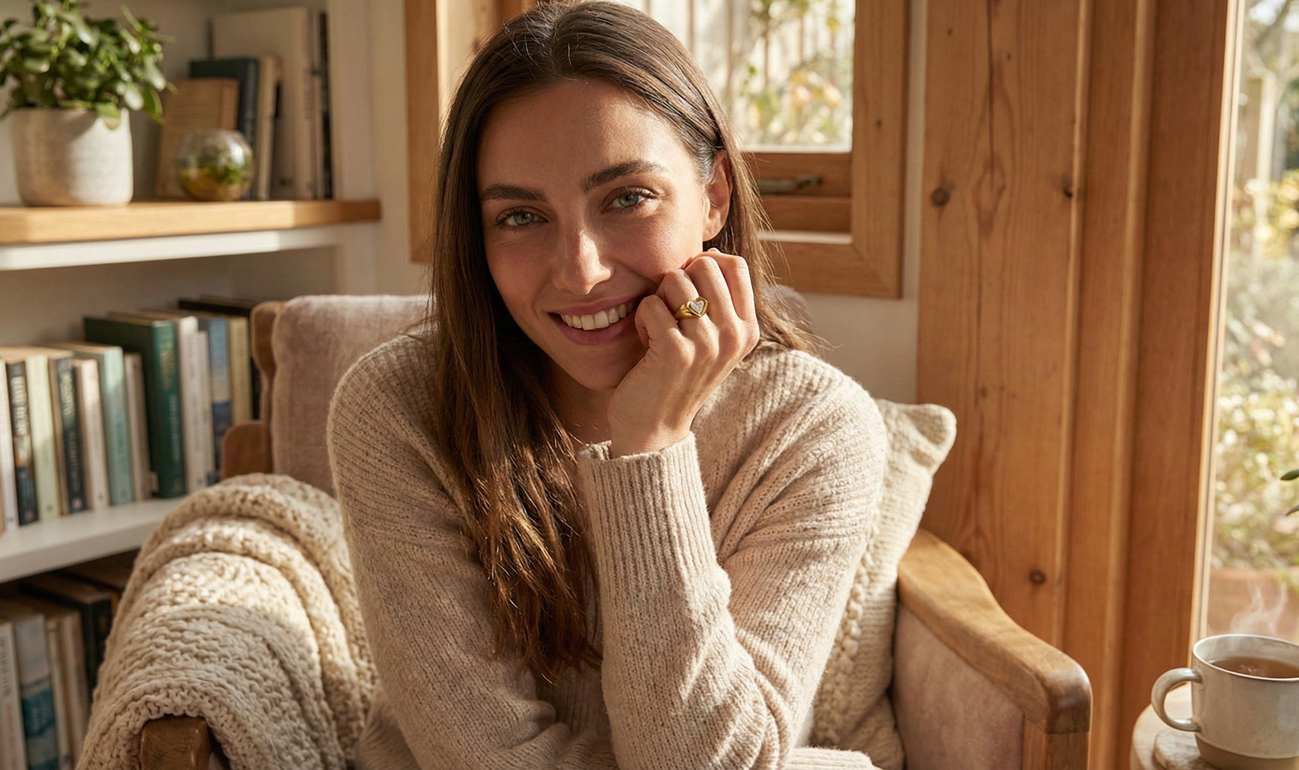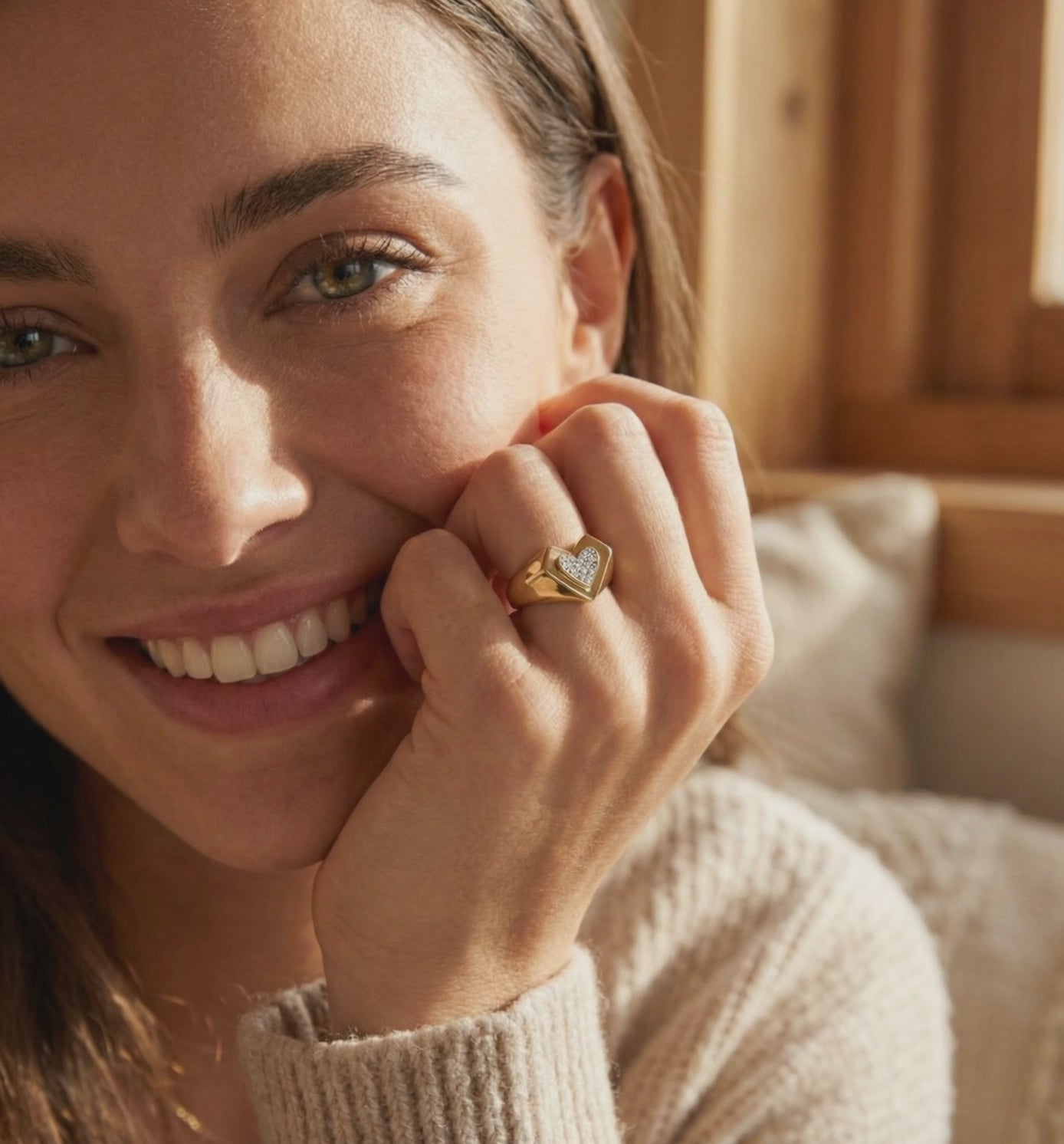 Elegant woman wearing a 14K gold heart signet ring with pavé diamonds on ring finger