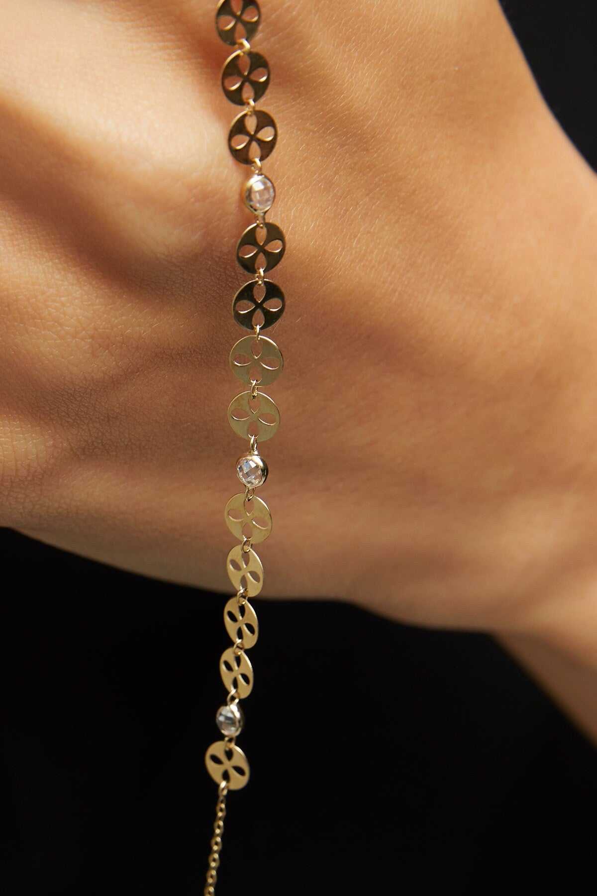 Delicate and radiant, this 14K gold bracelet features a row of floral cut-out discs and sparkling accents — perfect for adding a soft feminine glow to any outfit.