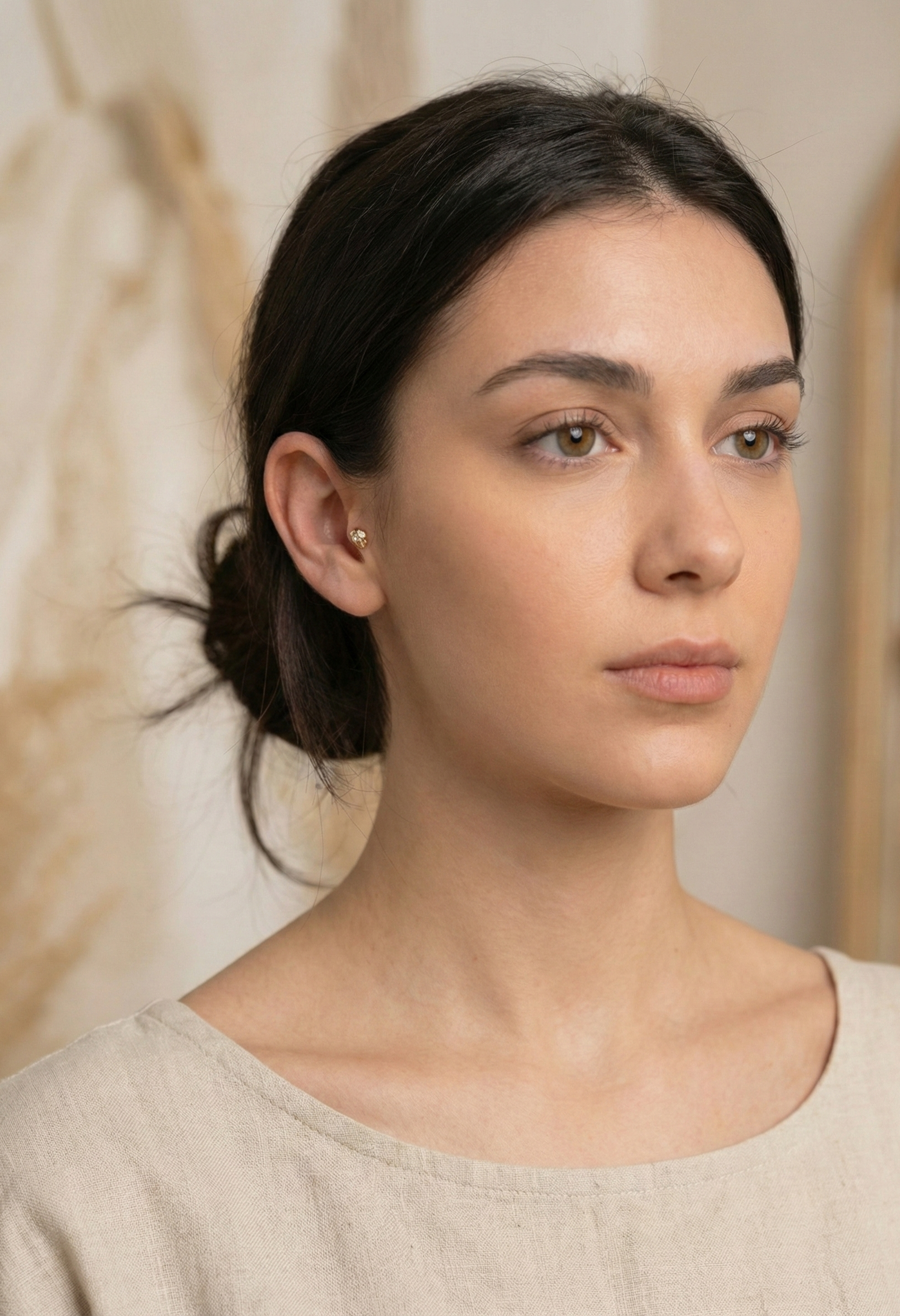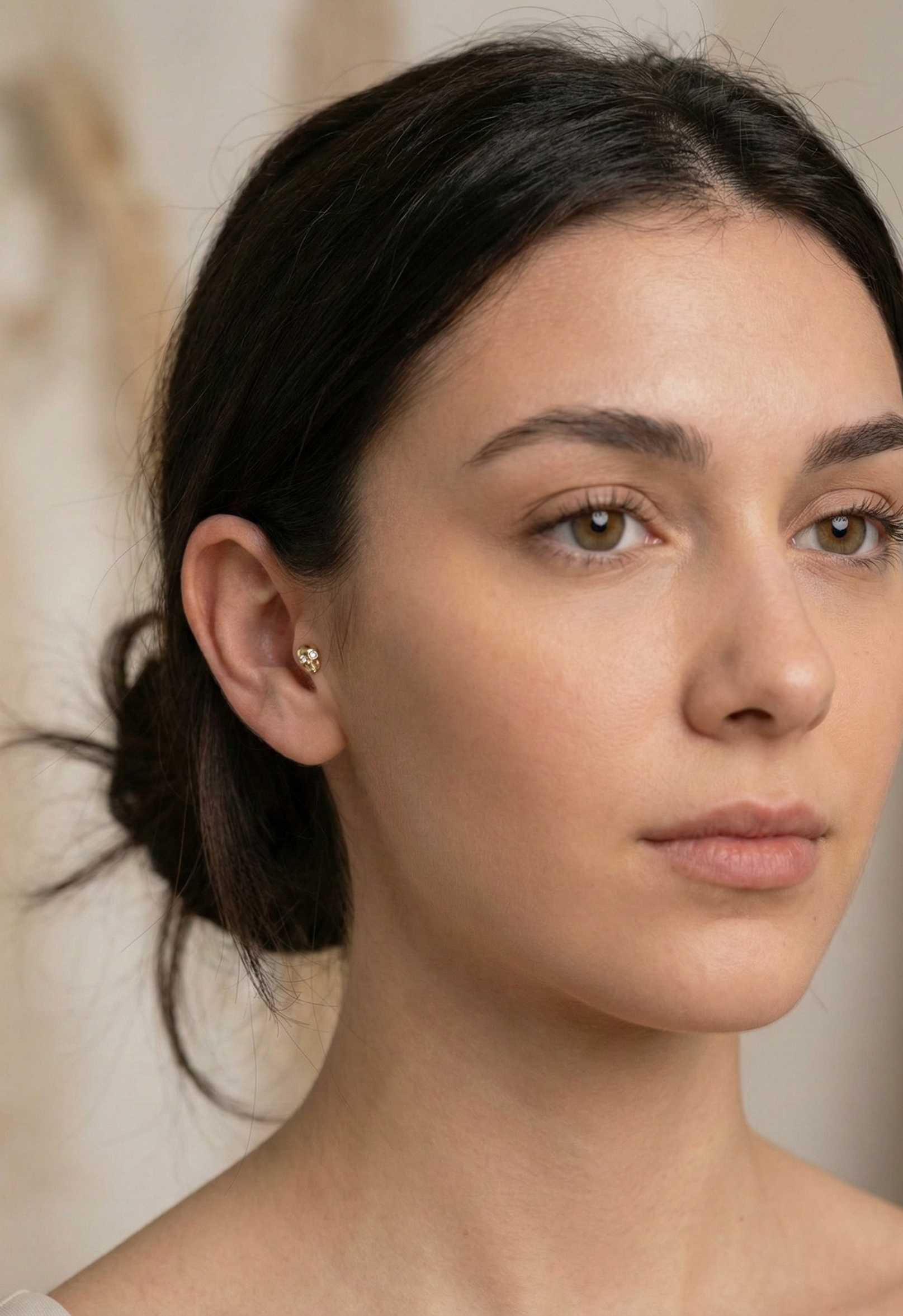Model showcasing a curated ear stack featuring a teardrop CZ helix stud, constellation-inspired cartilage piercing, floral tragus stud, and classic gold hoop – a mix of elegant and modern 14K gold cartilage jewelry