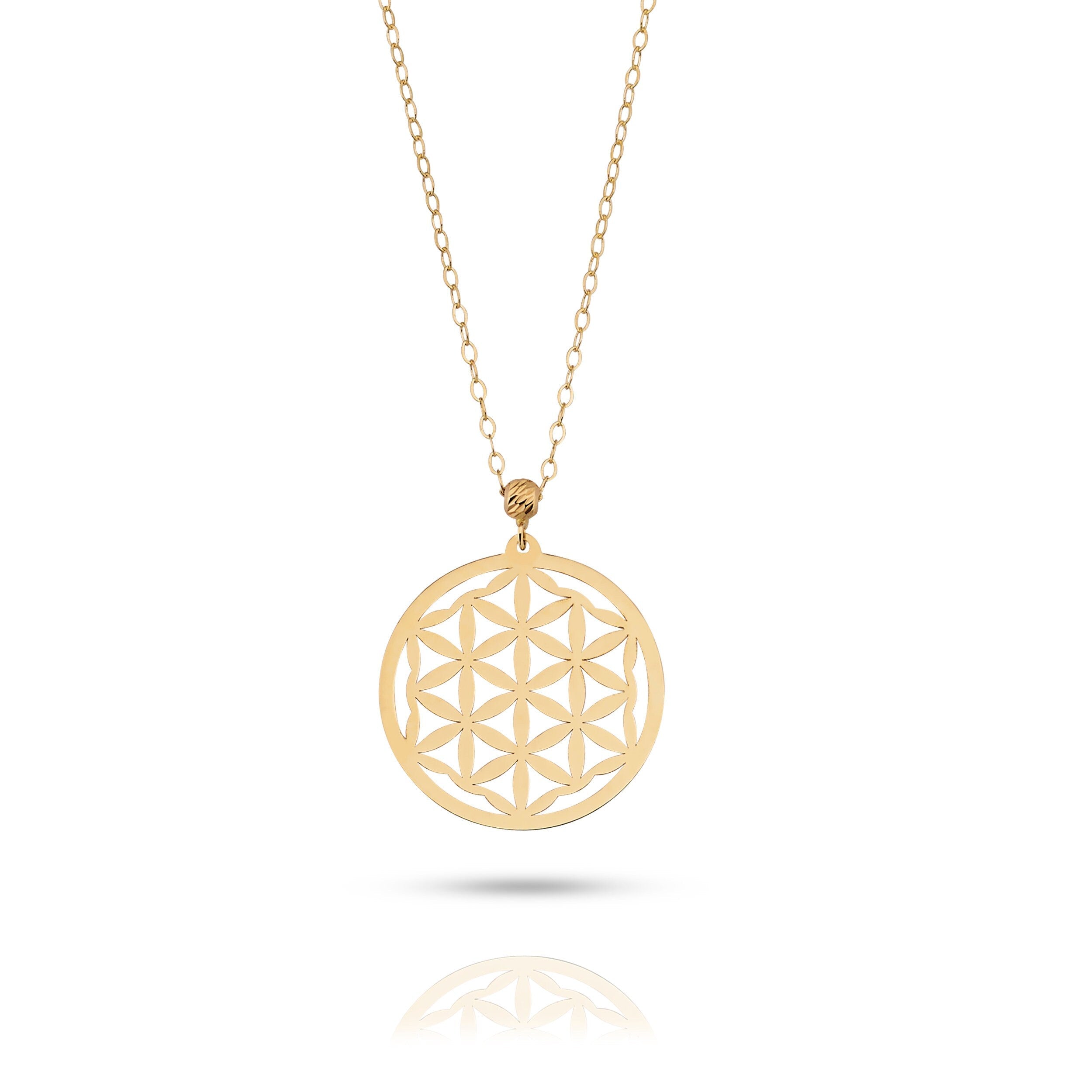 Embrace the power of sacred geometry with this mesmerizing 14K gold Flower of Life necklace, symbolizing creation, unity, and spiritual awakening. This delicate spiritual pendant is more than a fashion piece—it represents the interconnectedness of life and the divine structure of the universe. Handcrafted in solid 14K gold, it's perfect for those on a journey of mindfulness, healing, and intentional living. Whether you're gifting a loved one or honoring your personal spiritual practice, this sacred geometry necklace adds depth and style to your collection. Ideal for anyone seeking a meaningful gold pendant, energy healing jewelry, or a timeless symbol of cosmic balance.