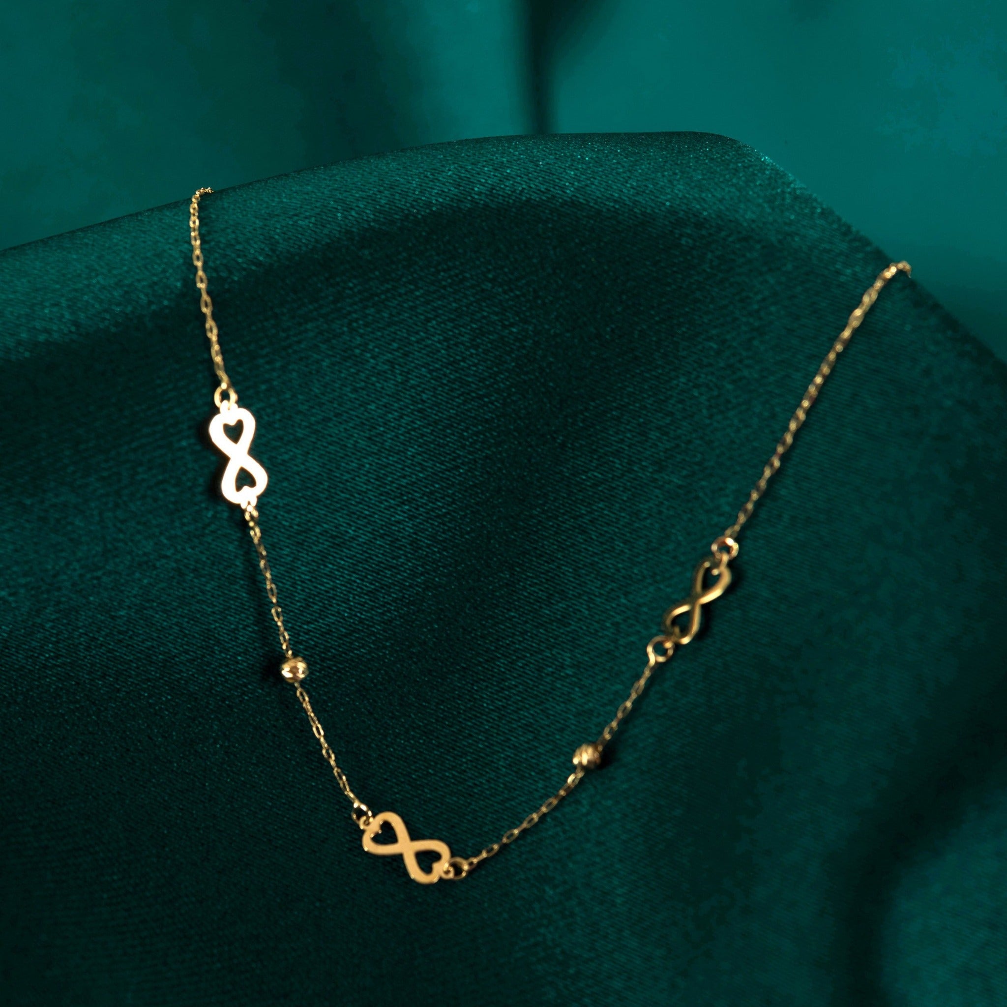 Delicado collar de oro de 14 quilates con múltiples dijes de infinito: un símbolo atemporal de amor, equilibrio y conexión eterna.