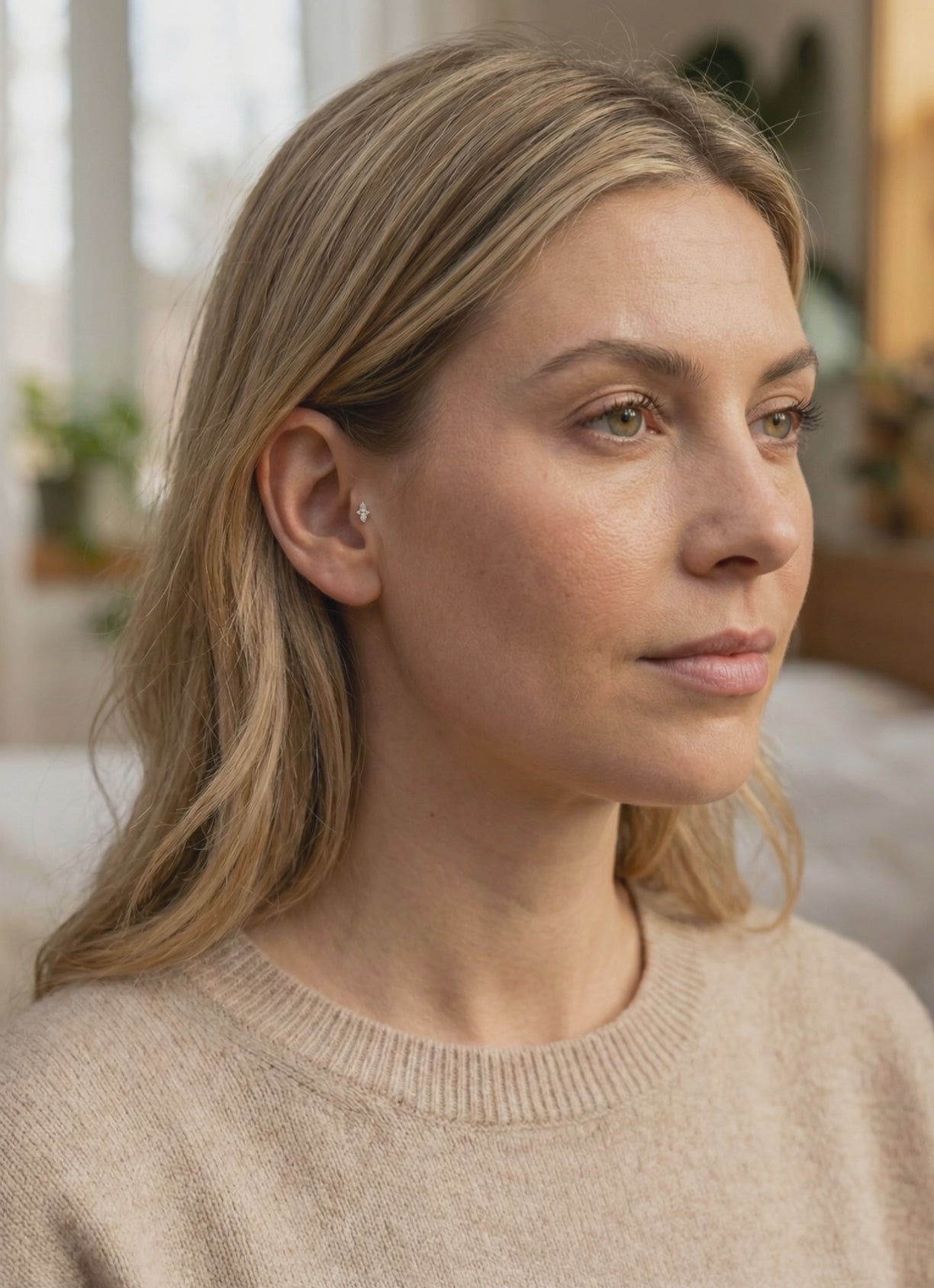 Une boucle d'oreille à tige en or 14 carats Ce bijou, comme celui-ci, apporte une élégance intemporelle aux piercings . Notre modèle arbore un cristal transparent étincelant serti dans un panier classique en relief. Fabriqué en or massif 14 carats , le métal est sans nickel et hypoallergénique, garantissant durabilité et finition brillante et résistante au ternissement. La pierre précieuse transparente de haute qualité ajoute un éclat brillant, rendant le bijou à la fois luxueux et discret. Selon les tendances du piercing, le tragus a le vent en poupe et privilégie les pièces « petites, simples et discrètes » , ce qui fait de ce piercing de cartilage minimaliste un choix idéal pour un style avant-gardiste.