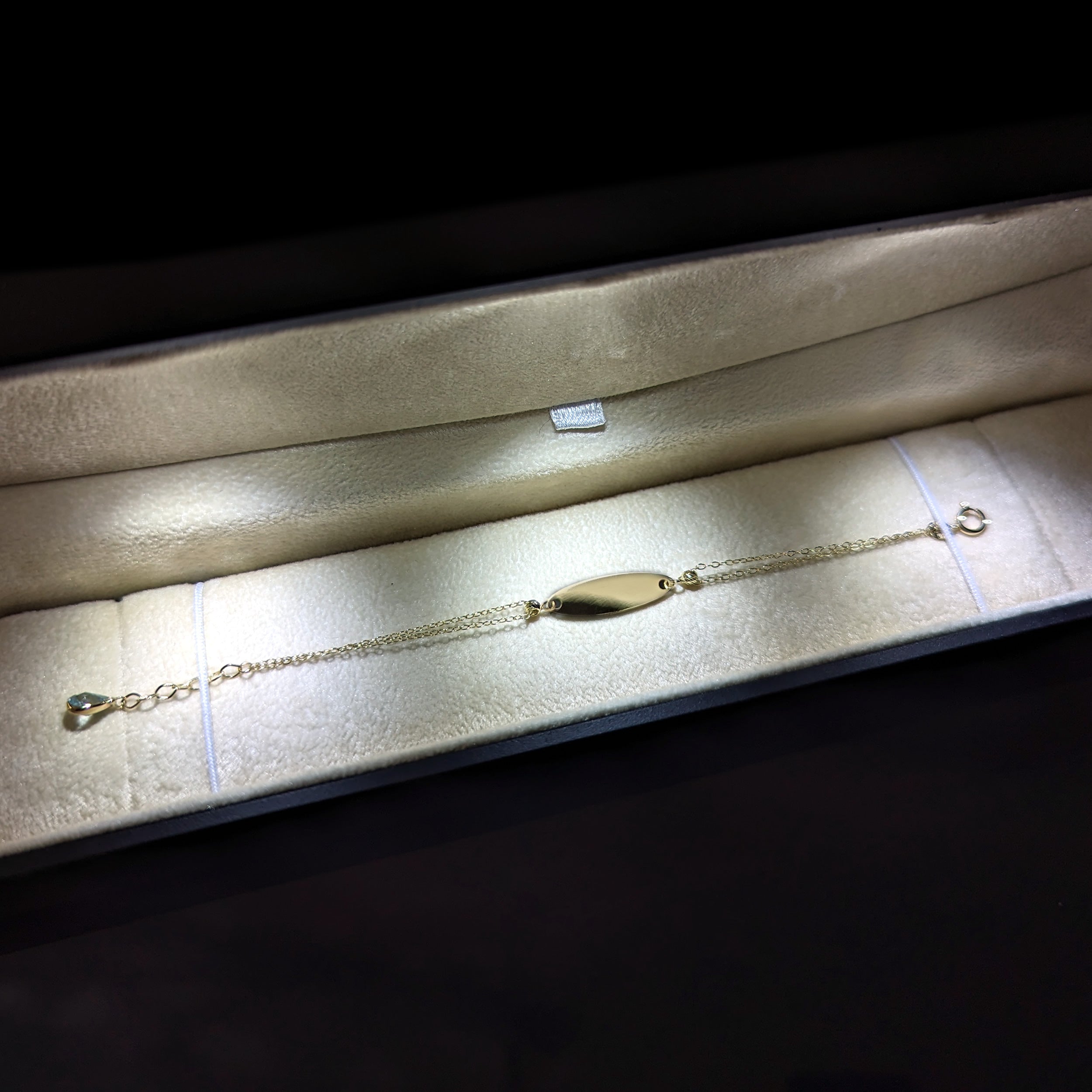 14K gold double chain bracelet with blank ID plate and teardrop crystal charm